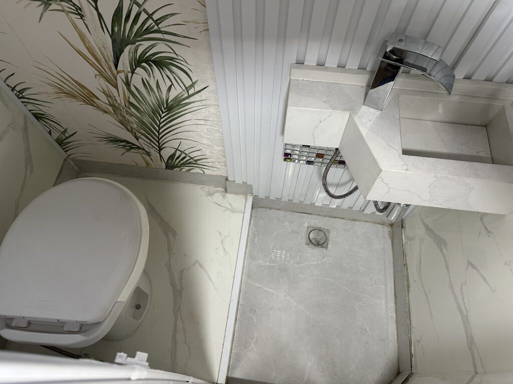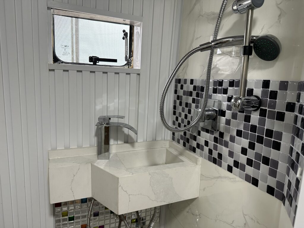Banheiro vaso fixo, lavatório e chuveiro água quente