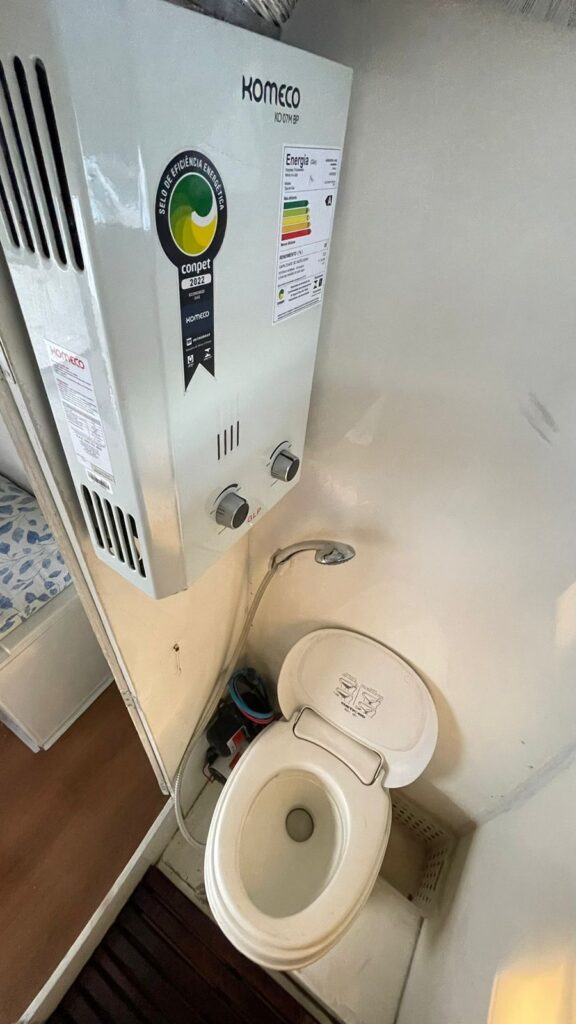 Ele tem a estrutura externa em fibra, é leve, não enferruja e é térmico. Ainda possui um deck no teto para ñ bater o sol diretamente.
