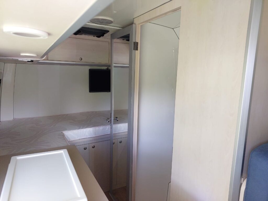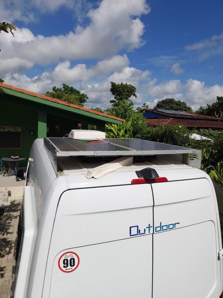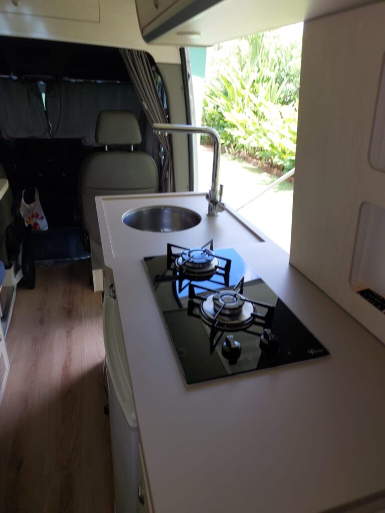 Motor-casa planejado para 2 pessoas, apesar de estar registrado para 3 pessoas. Com excelente autonomia de energia (elétrica, solar e de baterias estacionárias).