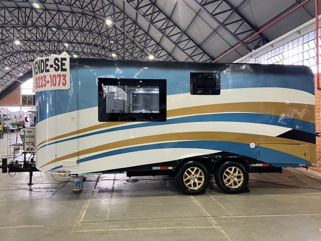 Lindo trailer à venda, pintura diferenciada e design único, acomodação para 4 pessoas, rodado duplo, com sistema de munheca com regulagem de altura e frenagem nas 4 rodas, Pneus 8 lonas, rodas exclusivas diamantadas com pintura Flake.