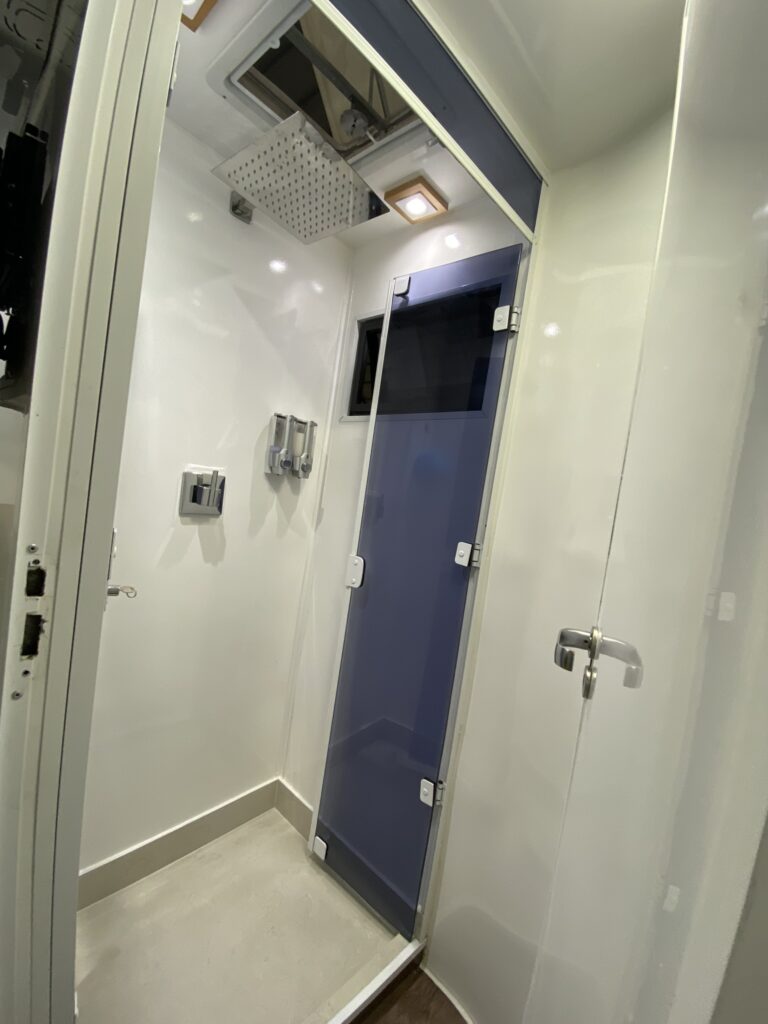 - Chuveiro conta com porta shampoo e condicionador, ducha grande e espaço para se vestir